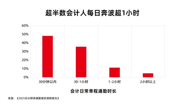 通勤不僅消耗時間,更直接影響工作狀態(tài)。62% 的會計人認為“通勤時間越長,工作效率越低”,到崗后需要額外時間“回血”才能投入工作。