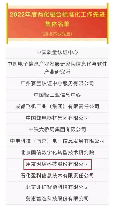 12月20日,全國兩化融合管理標準化技術委員會公布2022年度兩化融合標準化工作先進集體、先進個人、標準應用先進單位名單,用友網(wǎng)絡科技股份有限公司榮獲2022年度全國兩化融合標準化工作先進集體。
